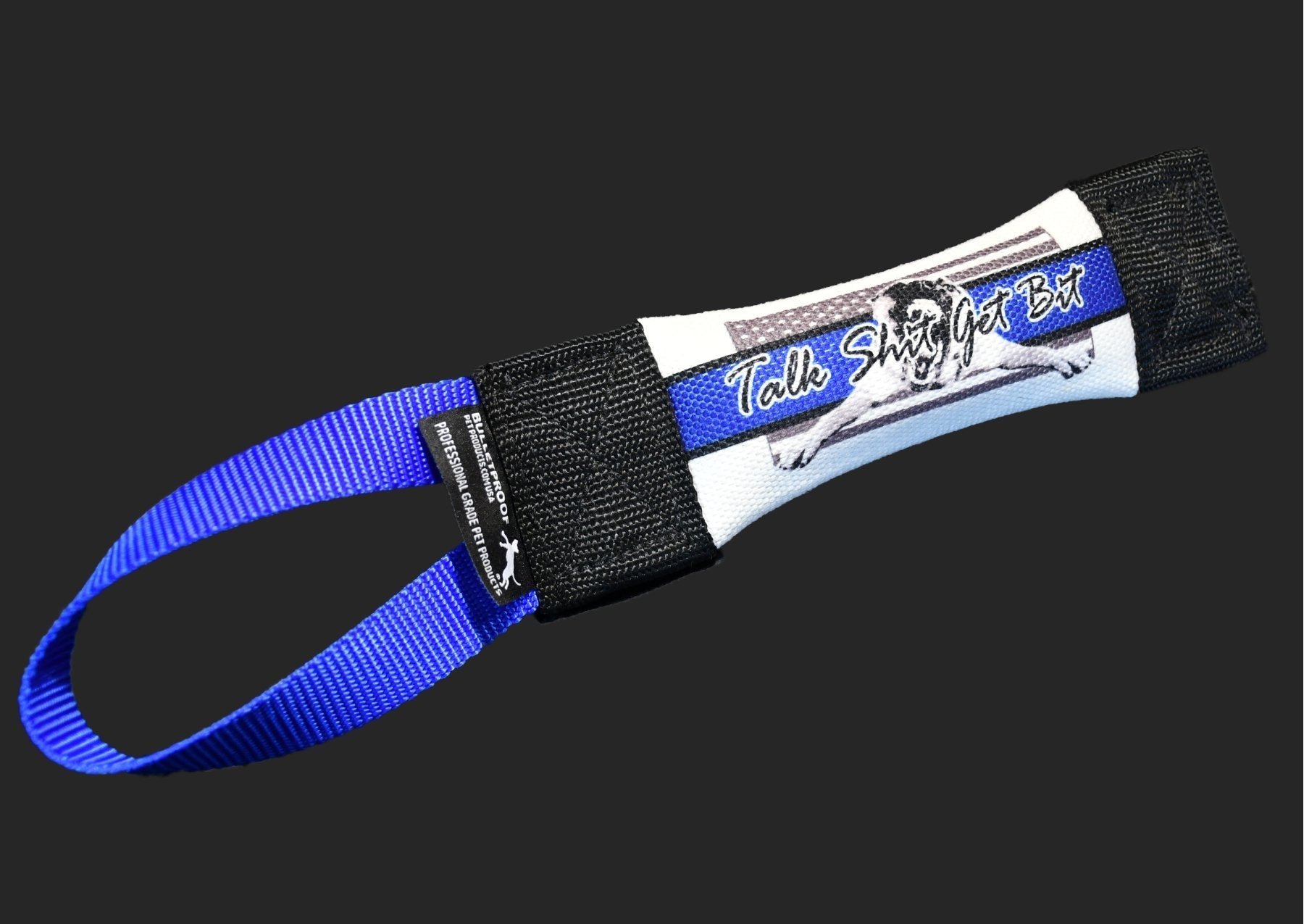 Introducing our TALK SHIT GET BIT FIRE HOSE POCKET TUG. Perfect for K9 handlers with working K9's. As this tug is shorter than a regular tug, it will fit in most pockets to provide an immediate reward for your K9 partner. (It is 9" long, not including the loop/handle, 7" in diameter and 3" wide. This is one tough tug and it will float. Each tug is made to order, made to last and MADE IN THE USA. These are extremely heavy duty!